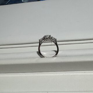 This is a classic 14 karat white gold engagement ring built around a bright one and a half carat DVS one lab grown center, with a pair of forty point side stones that sit in a neat three prong layout instead of the usual four. It is a small twist on a timeless style and it catches the eye in a quiet, confident way.