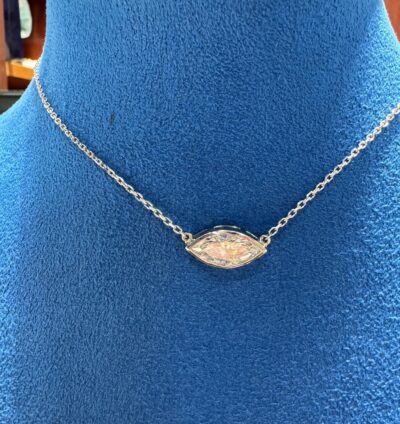 Picture a marquise cut diamond that doesn’t need an introduction. This one is 1.79 carats, lab grown, bright E color and VS1 clarity. We set it on a simple 14 karat white gold chain so the shape and sparkle stay front and center. It’s a clean, elegant look that feels dazzling every time you put it on.