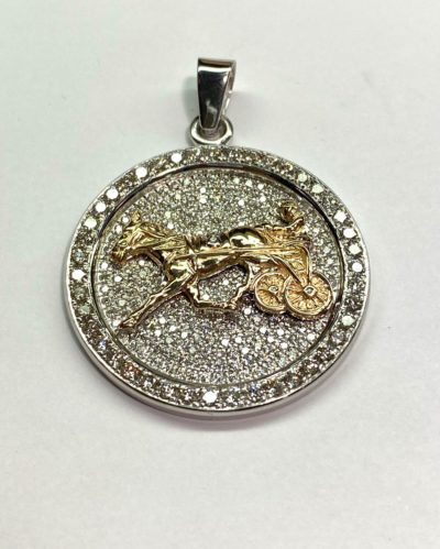 14k gold pendant featuring 4 1/2 CT’s of diamonds. Made for a horse owner. Enjoy the ‘trotter’ and the ‘surry’.
