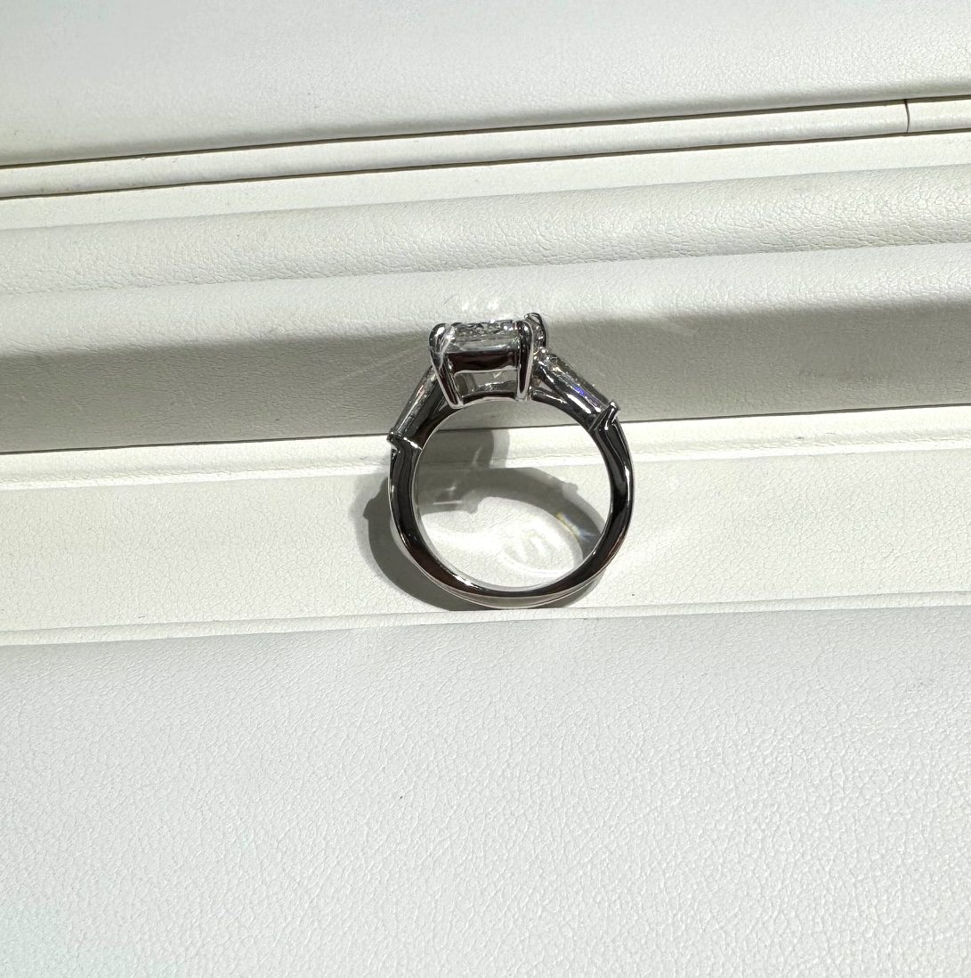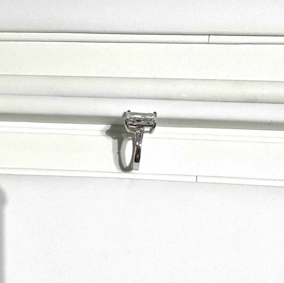 A hand made platinum ring built around a bold 4 carat radiant cut, paired with just under a carat of baguette diamonds on the sides. The whole thing gives off a steady, confident sparkle that speaks for itself.