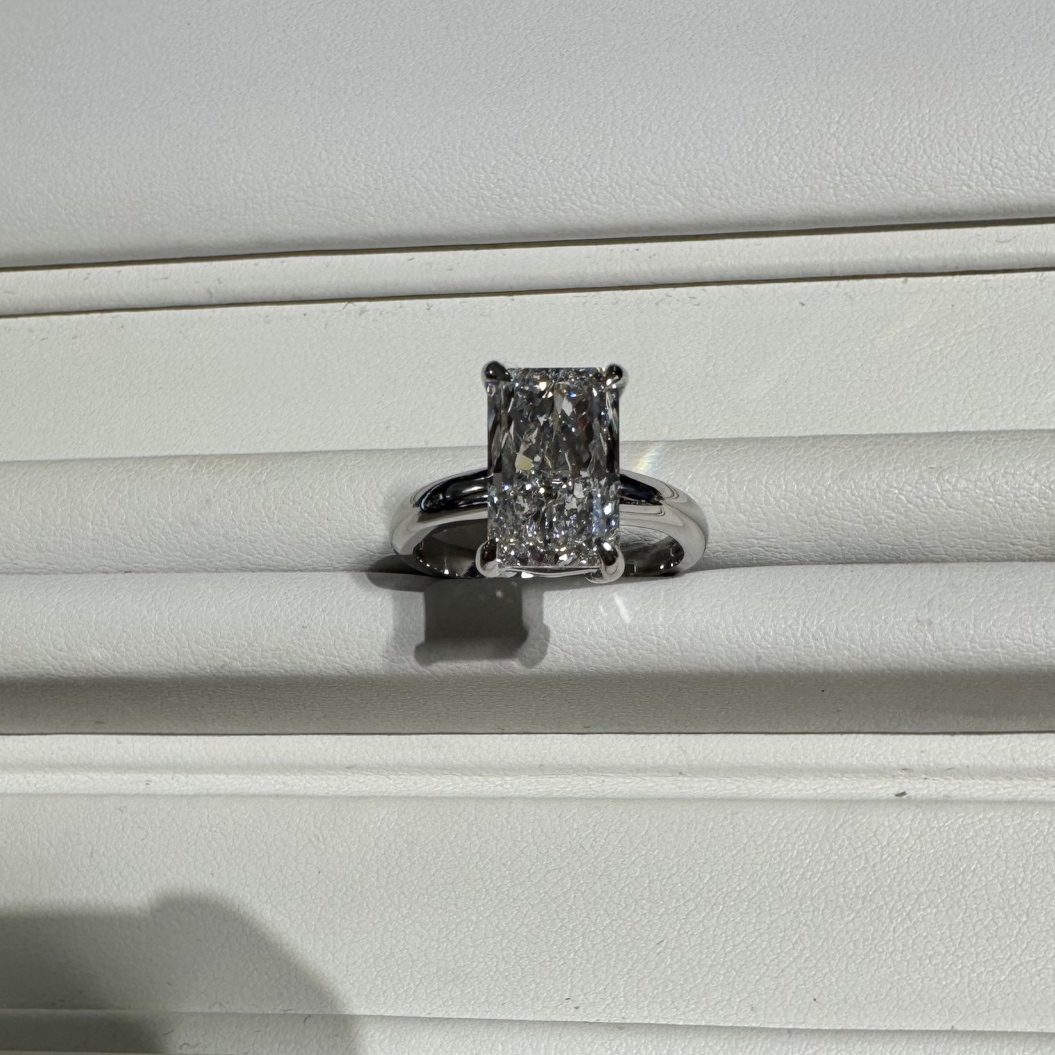 Two views of our custom platinum ring holding a 4 carat radiant cut lab grown radiant diamond, D color and VVS2 clarity. Clean and bright, it sits low and shows off that crisp sparkle from every angle.
